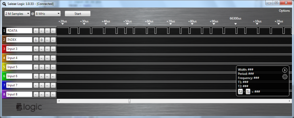 Having seen some great devices on the net such as this Floppy Disk Emulator I wanted to do some tinkering myself (having said that this product is on my wish list for sure). So this week I bought myself a logic analyser from Saleae. What a fantastic little gadget. Cost something like £110 delivered by 24/48 hour courier. My oscilloscope was useless since the data on the read line is not consistent and it’s not a storage scope.