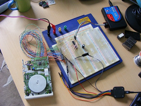 In this picture you can see the logic analyser in the bottom right-hand corner. The drive is a Sony MFP920-Z/131. The IC on the breadboard is a Microchip PIC18F2525 which I am using to control the drive (such as select, motor control, head seeking, read/write control. etc). In the top right is the excellent Real Ice in-circuit emulator.